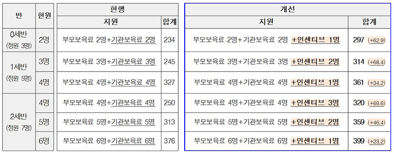 정원이 7명인 2세반에 현원이 4명이면 69만 6000원을, 현원이 5명이면 46만 4000원 그리고 현원이 6명이면 23만 2000원을 추가로 지원할 계획이다.