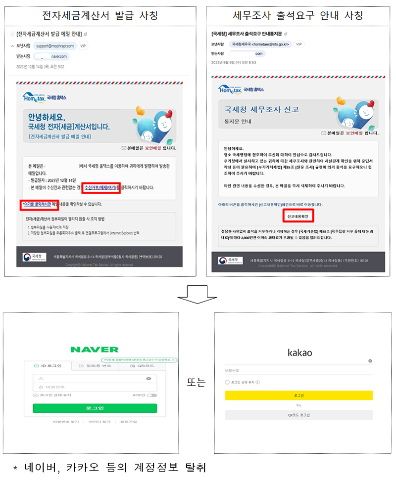 국세청은 부가가치세 신고와 연말정산 시기를 맞아 전자세금계산서 발급, 세무조사 출석요구 안내 등 국세청을 사칭한 다양한 악성 이메일과 문자메시지 등이 유포될 우려가 있어 각별한 주의가 필요하다고 당부했다.