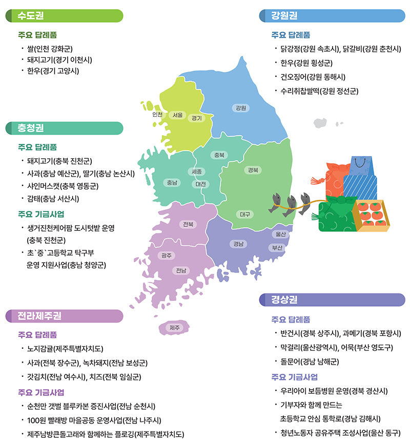 지난 1년 동안 총 답례품 포인트는 193억 원을 지급했으며 기부자의 실제 답례품 구매액은 151억 원이었는데 답례품별 구매액 비중은 농·축산물(38.3%), 지역사랑상품권(26.0%), 가공식품(24.5%), 수산물(7.3%) 등 순이었다.