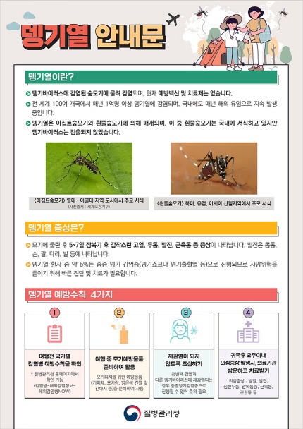 정의관 대구광역시 보건복지국장은 “해외여행 시 뎅기열 예방을 위해 모기 기피 용품을 준비하고, 외출 시 밝은색 긴 옷 착용, 모기 기피제 사용 등을 통해 모기에 물리지 않는 것이 중요하다”며, “의심 증상이 있을 시에는 검역소 뎅기열 신속키트검사를 적극 활용해 주실 것”을 당부했다.