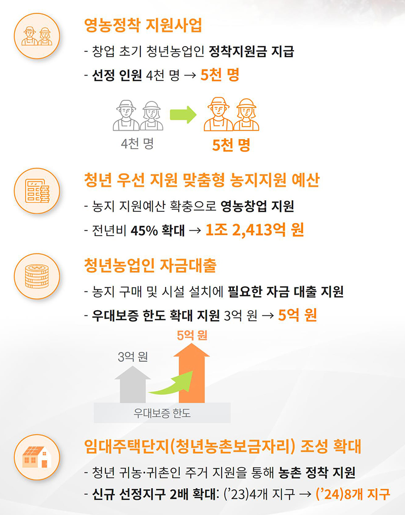 특히 영농 창업을 위해 필수적인 농지 확보에 어려움이 없도록 청년에게 우선 지원하는 맞춤형 농지지원 예산을 2023년보다 45% 확대해 올해 농업 분야 청년창업 지원을 더욱 강화할 계획이다.