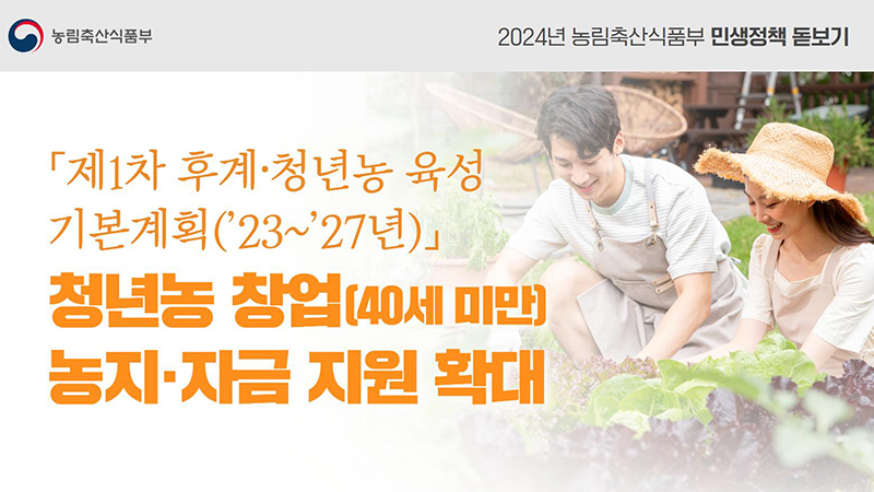 농식품부는 농업에 관심있는 청년(40세 미만)들의 창업을 지원하기 위해 제1차 후계청년농 육성 기본계획(2023~2027년)을 마련해 종합적으로 지원하고 있다.