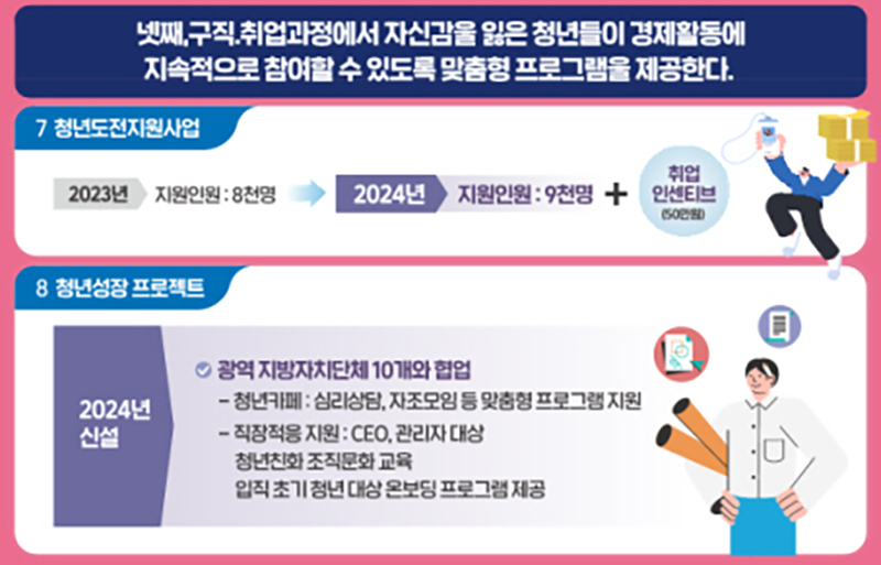 한편 청년들 누구나 일상 및 구직의욕을 유지할 수 있도록 상담과 맞춤형 프로그램을 제공하고 청년정책으로 연계되도록 지원하는 청년성장 프로젝트도 10여 개 광역자치단체에서 새롭게 시행한다.