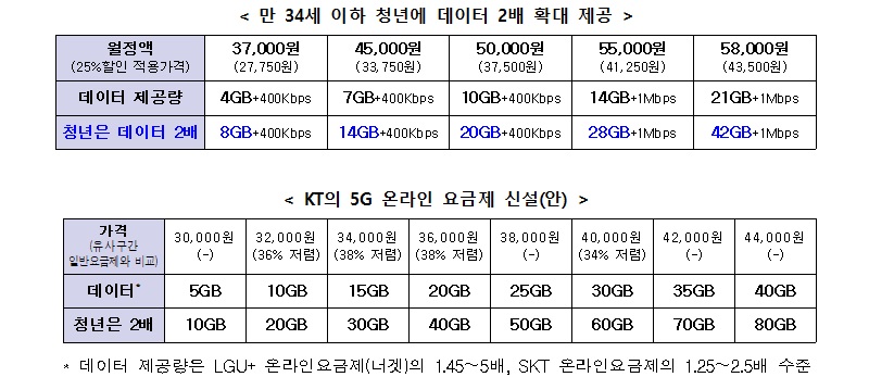 또 기존 4만 5000원 요금제의 데이터는 5GB에서 7GB로, 5만 5000원 요금제는 10GB에서 14GB로 데이터 제공량을 확대한다.