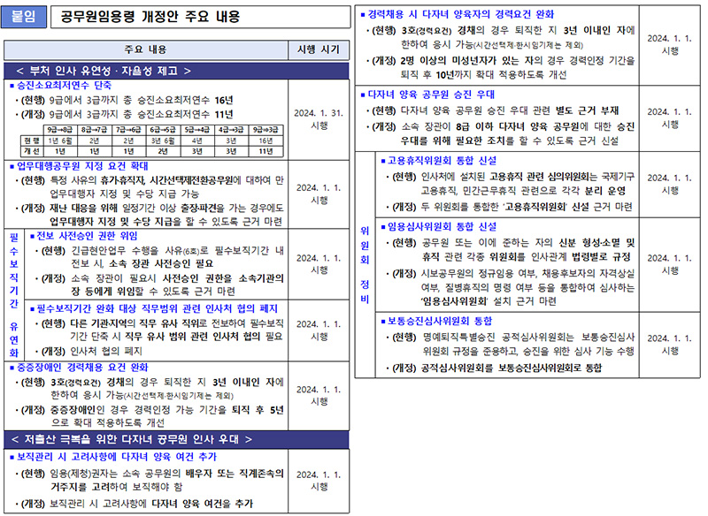 저출산 위기 극복에 기여하기 위한 개선도 눈에 띈다. 인사처는 다자녀 양육자에 대한 채용, 승진 등 인사상 우대 근거를 마련하는 등의 내용을 담은 ‘공무원임용령’ 개정안을 지난해 10월 입법예고, 해당 개정안은 12월 국무회의를 통과했다.