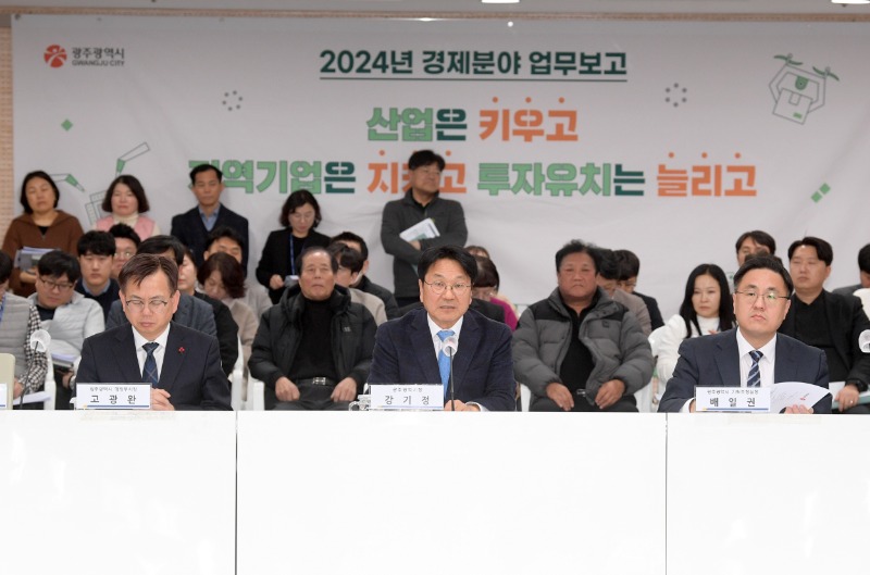 광주광역시(시장 강기정)는 24일 광주시청 중회의실에서 지역 기업인, 소상공인, 창업기업, 건설사, 민생대책본부 위원, 유관기관 관계자 등 70여명이 참석한 가운데 ‘2024년 경제분야 업무보고회’를 개최했다.