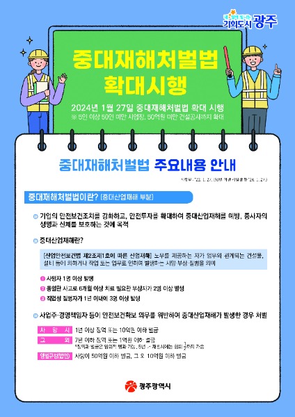 광주광역시(시장 강기정)는 27일부터 중대재해처벌 등에 관한 법률이 상시근로자 50인 미만 사업장(5~49인)까지 확대 시행됨에 따라 관계기관과 협업해 적극 대응한다.