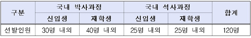 이에 박사과정생 70명과 석사과정생 50명 등 총 120명 내외로 장학생을 선발해 박사과정생에는 월 200만원을, 석사과정생은 월 150만원을 지급할 계획이다.