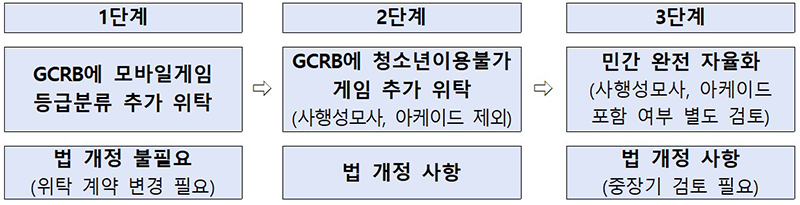 한편 연령 등급 및 게임 종류에 따라 공공과 민간에 각각 분리되어있는 등급분류 권한을 단계적으로 민간에 이양한다.