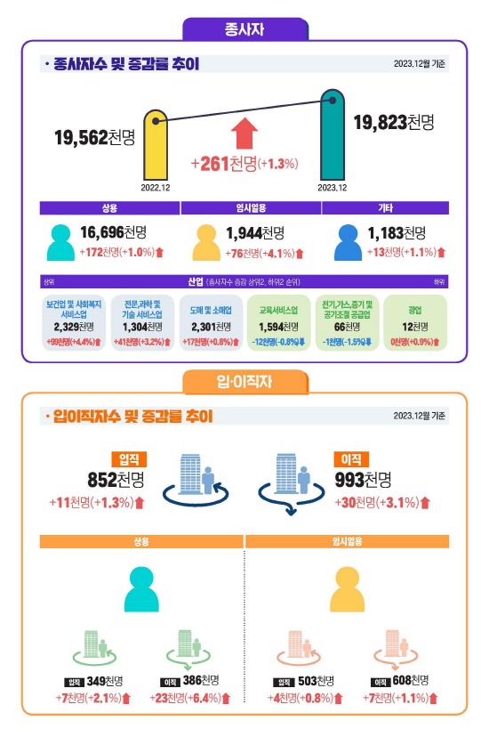 (총괄) ’23.12월 중 입직자는 852천명으로 전년동월대비 11천명(+1.3%) 증가, 이직자는 993천명으로 30천명(+3.1%) 증가