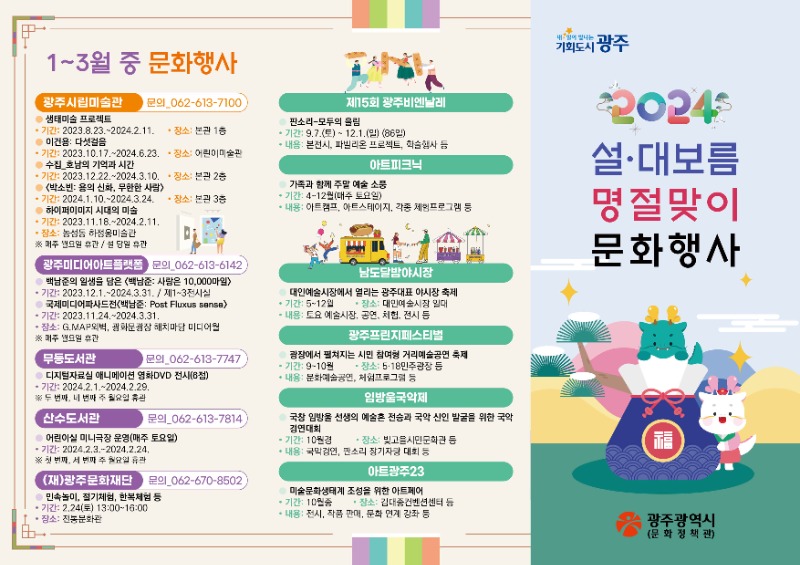 국립아시아문화전당 일원에서는 2024 다복다복 설날맞이 프로그램으로, 아시아 전통놀이마당, 갑진년 푸른 용 딱지 만들기, 으라차차 신년 윷점 한판!, 청룡과 찰칵 행사를 준비했다.