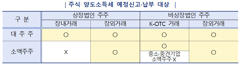 완화된 대주주의 시가총액 기준(50억 원)은 오는 8월 예정신고 대상(올해 1월 1일 이후 양도분)부터 적용한다.