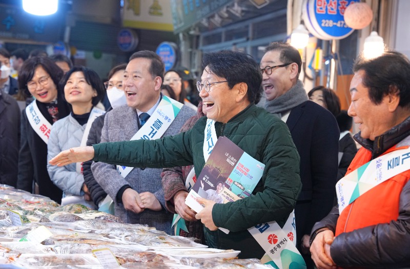 강기정 광주광역시장이 설 연휴를 앞둔 6일 오전 동구 대인시장을 찾았다. 고금리·고물가 등에 따른 소비위축으로 어려움을 겪는 상인들을 격려하고, 침체된 전통시장의 활로를 함께 논의하기 위해서였다.