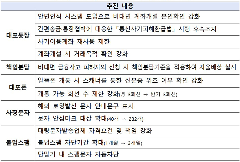 보이스피싱 등 범죄 수단으로 사용되는 대포통장·대포폰·미끼문자 등을 차단하기 위한 대책도 강화해 속도감 있게 추진한다.