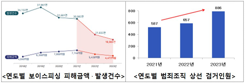 또 수사당국은 지난해 한 해 2만 991건, 2만 2386명을 검거했고 범죄 수익 환수 등을 위해 핵심적인 조직 상선은 2022년에 비해 35% 증가한 886명을 검거하는 성과를 냈다.