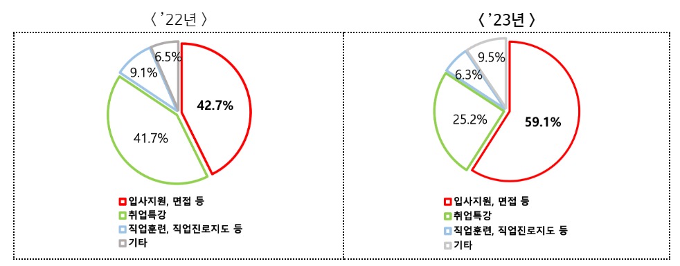 재취업률 상승에는 무엇보다 실업급여 수급자들의 적극적인 재취업 활동 증가가 주요했다. ’23년 수급자의 수급기간 중 재취업 활동 비중을 살펴보면 입사지원·면접·채용행사 등 직접 일자리를 찾기 위한 활동이 ’22년 42.7%에서 59.1%로 크게 증가했다.