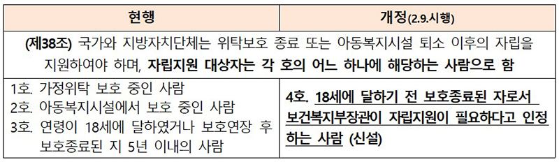 한편 이번 개정에 따라 신규로 15세 이후 보호종료되는 아동은 당연 적용되며, 법 시행일 전에 15세 이후 보호종료된 아동은 오는 9일 이후 18세가 되는 아동부터 지원을 받는다.