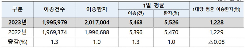 소방청, 2023년 119구급차 이용현황 분석…전체 201만 여명 이용