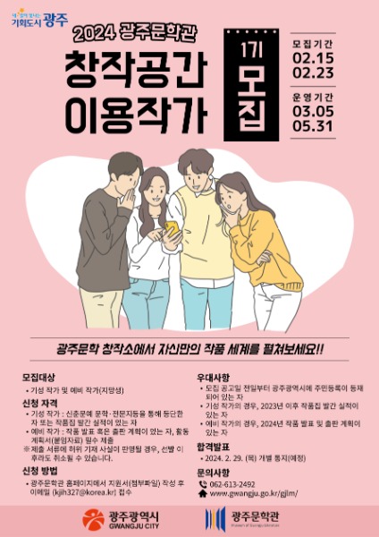 광주문학관은 기성 작가와 예비 작가의 작품 창작을 지원하기 위해 ‘2024년 제1기 창작공간 집필 작가’를 모집한다.