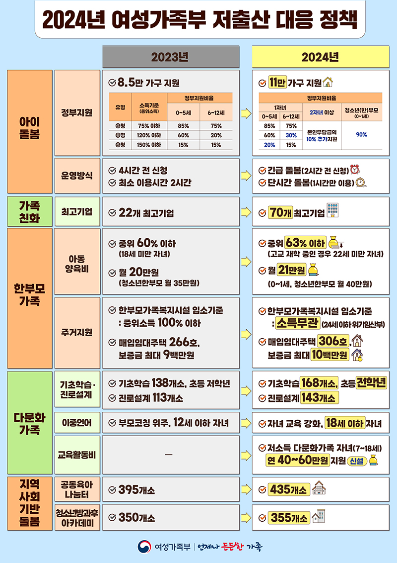 여가부는 아울러 맞벌이 가정의 자녀 양육 부담 완화를 위한 아이돌봄 서비스의 정부 지원 가구 수를 8만 5000가구에서 11만 가구까지 확대하고 두 자녀 이상의 다자녀 가구에게 본인부담금의 10%를 추가 지원하기로 했다. 청소년(한)부모의 경우에는 아이돌봄 서비스 이용 금액의 90%를 지원한다.