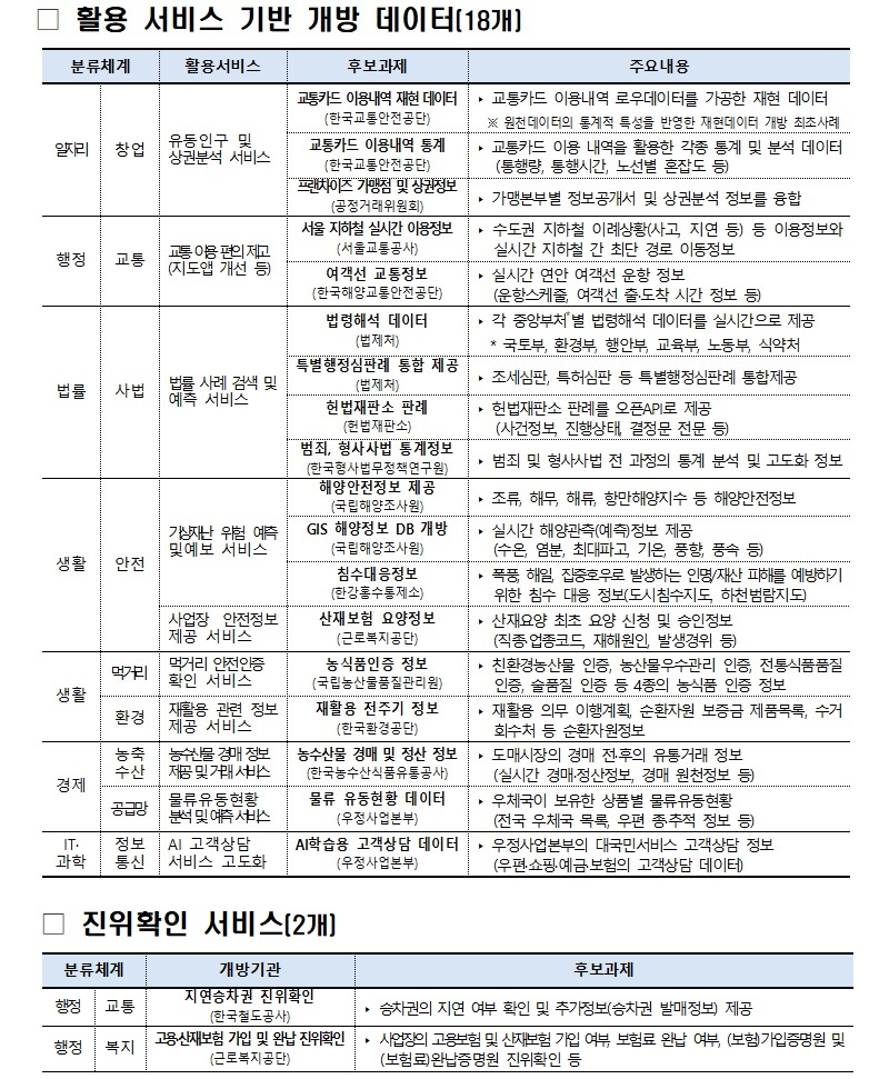 이에 따라 올해 개방되는 국가중점데이터는 민간서비스 완결형 데이터 18개, 진위확인 서비스 2개 등 모두 20개 분야 공공데이터다.
