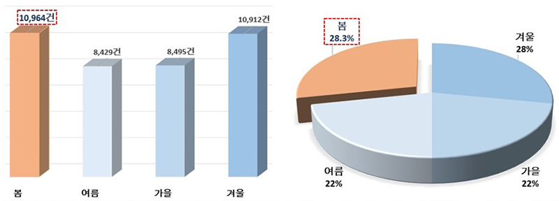 최근 5년 동안 봄철 화재발생 건수는 5만 4820건으로, 전체의 28.3%를 차지해 계절별로 보면 가장 많았고 뒤이어 겨울(28.1%), 가을(21.9%), 여름(21.7%) 순이었다.