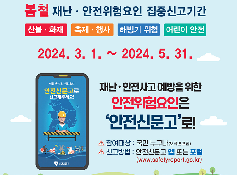 행정안전부는 봄철 재난과 안전사고 예방을 위해 1일부터 오는 5월 31일까지 안전신문고에 ‘봄철 재난·안전 위험요인 집중신고기간’을 운영한다고 밝혔다.