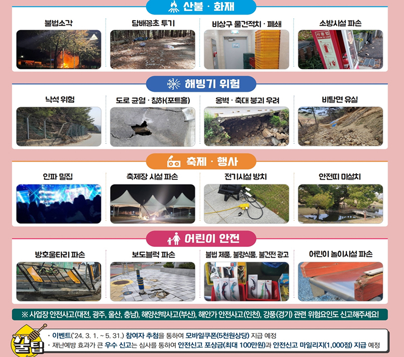 이번 집중신고 대상은 산불·화재, 축제·행사, 해빙기 위험, 어린이 안전과 관련된 위험요인으로, 특히 재난 예방 효과가 큰 우수 신고는 최대 100만원 포상금(상품권)을 지급하기로 했다.