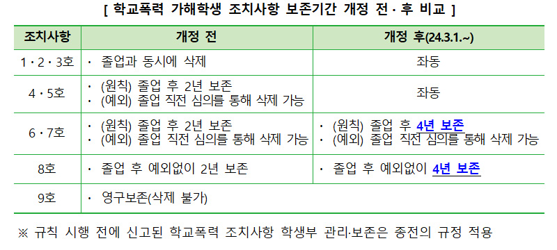 우선, 이달부터 신고·접수된 학교폭력 사안부터 중대한 학교폭력을 일으킨 가해 학생의 학교폭력 조치 중 출석 정지(6호), 학급 교체(7호), 전학(8호) 조치의 학생부 기록 보존 기간이 졸업 후 2년에서 4년으로 연장된다.