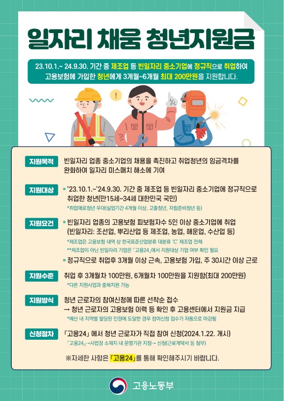 일자리채움 청년지원금은 일자리 미스매치를 해소하기 위해, 빈 일자리 업종의 중소기업에 취업한 청년들에게 최대 200만원을 지원하는 제도이다. 지원 대상은 만15~34세 청년 중 ①제조업 등 중소기업(고용보험 피보험자 수 5인 이상)에 ②’23.10.1. 이후 정규직으로 취업(주30시간 이상)하여 ③3개월 이상 근속한 근로자이다. 해당 청년은 누리집 「고용24」에 근로계약서와 재직증명서를 첨부하여 지원을 신청할 수 있으며, 총 200만원(3개월 차 100만원, 6개월 차 100만원)을 직접 계좌로 지급받는다.