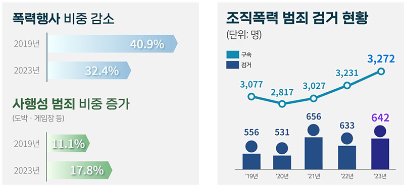 사회 발전에 따른 범죄 추세 변화에 따라 2019년부터 최근 5년 동안 전통적 조폭 범죄인 폭력행사 비중은 40.9%에서 32.4%로 감소했다.