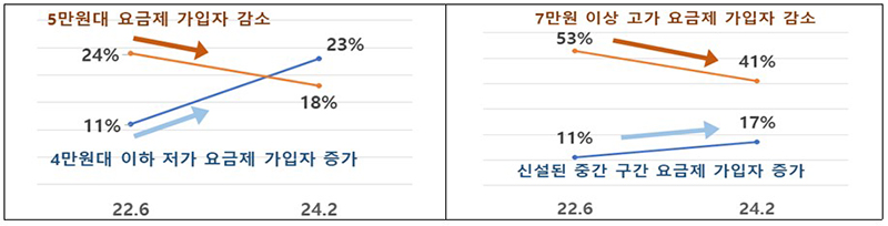7만 원 이상 고가 요금제 이용자는 신설된 중간 구간으로, 5만 원대 요금제 가입자는 4만 원대 이하 요금제로 하향 변경하는 추세가 뚜렷하며 시간이 지날수록 변동폭은 더 커질 것으로 기대된다.