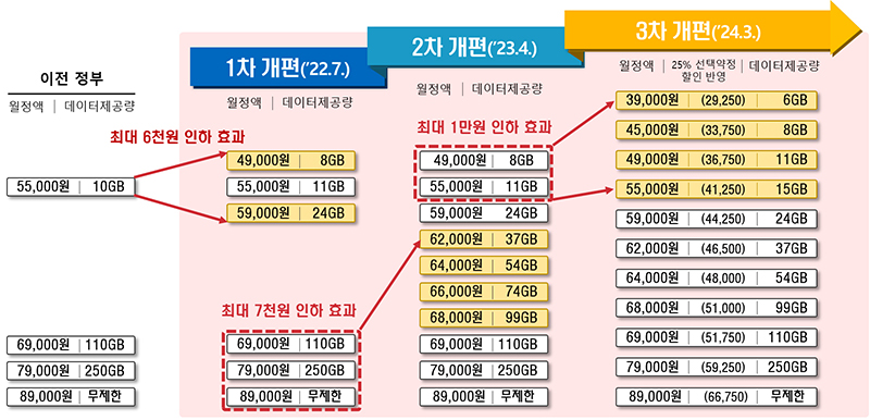 한편 정부는 고가 중심 5G 요금제를 중저가 중심으로 개편, 이용자가 실제 쓰는 만큼 요금을 낼 수 있도록 데이터 제공량을 세분화했고 다양한 이용패턴을 반영해 가격은 저렴하고 혜택이 강화된 청년·고령층·알뜰폰·온라인 요금제를 4월에 신설했다.
