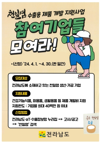 참여 대상은 전남에서 천일염을 원재료로 고부가가치 가공품을 생산하는 기업체로서 건강기능식품, 미용품, 생활용품, 식품 등의 제품 개발비나 제품의 안전성 검증, 과학적 효능·기능 인증 항목 등을 지원한다.