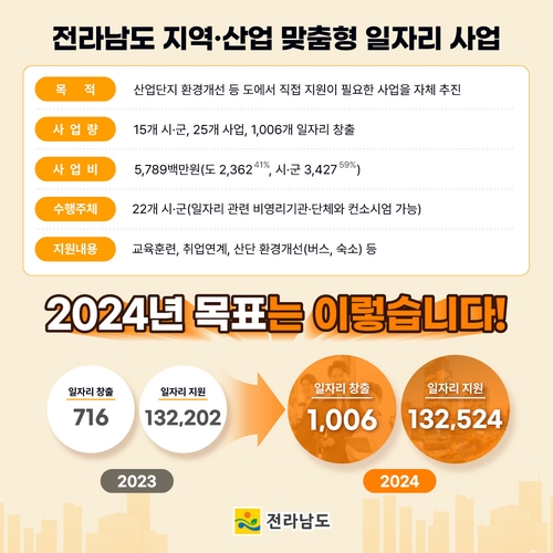 전라남도는 이달부터 시군별 산업 특성에 맞는 일자리사업 활성화와 고용기회 확대를 지원하는 '2024년 도 공모 지역·산업 맞춤형 일자리 창출 지원사업'을 추진한다고 밝혔다.