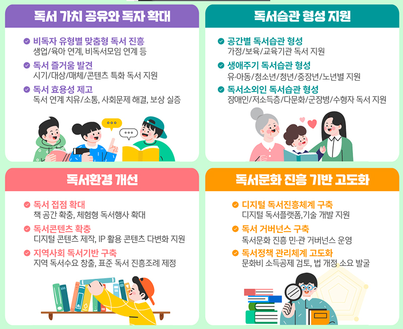 문체부는 비독자의 독자 전환을 핵심으로 제4차 독서문화진흥 기본계획을 수립했다. 특히 성인 중 과반이 1년에 책을 한 권도 보지 않는 현 상황에 집중해 독서의 저변 확대를 비전으로, 비독자의 독자 전환과 책 친화 기반 조성을 목표로 삼았다.