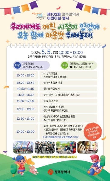 광주광역시(시장 강기정)는 제102회 어린이날을 맞아 오는 5월 5일 오전 10시 시청 앞 잔디광장(우천 때 시청 시민홀)에서 어린이날 행사를 개최한다.
