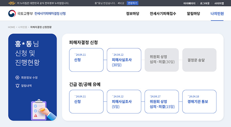 지금까지 전세사기피해자 결정신청과 긴급한 경·공매 유예·정지 신청을 위해선 관련 서류를 준비해 광역지자체에 방문 접수해야 했는데, 국토부는 이 같은 불편을 해소하기 위해 지난해 10월부터 시스템을 구축해 왔다.