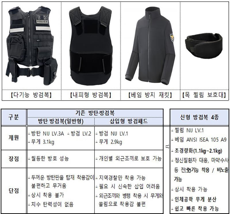 이번에 보급하는 장비는 다기능 방검복, 내피형 방검복, 배임 방지 재킷, 찔림 방지 목 보호대 등 신형 방검복제 4종과 충격을 최소화하고 투명한 재질로 시야를 확보할 수 있는 신형 중형방패다.