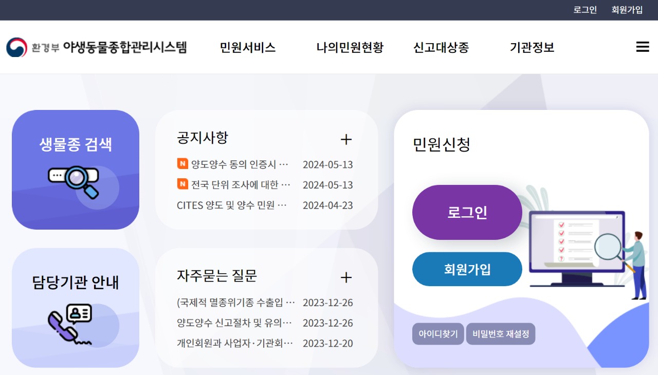 환경부는 야생동물의 허가 및 신고 민원신청 처리의 편의성과 효율성을 높이고자 야생동물종합관리시스템을 구축해 운영 중이다.