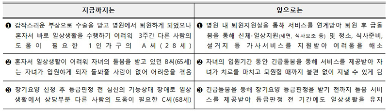 이에 질병, 부상, 갑작스러운 주돌봄자의 부재로 혼자 일상생활을 수행하기 어려움에도 돌볼 수 있는 다른 가족이 없거나 타 서비스를 이용할 수 없는 경우 긴급돌봄 서비스를 이용할 수 있게 된다.