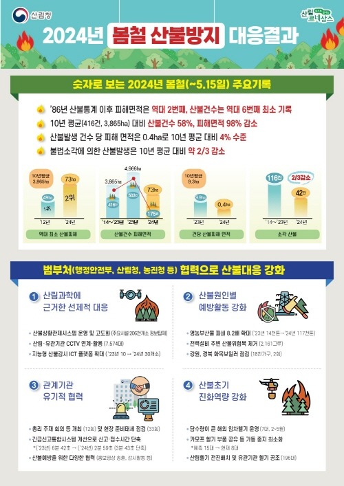 남성현 산림청장은 “올해 산불은 숫자가 보여주듯 피해가 역대급으로 감소했다”라며 “첨단기술 활용과 과학적 대응으로 산불 피해를 줄이고, 산림재난으로부터 국민의 생명과 안전을 지키는데 더욱 노력하겠다”라고 말했다.