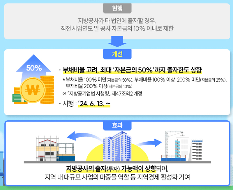 기존에는 지방공사의 다른 법인에 대한 출자한도가 일률적으로 공사 자본금의 10%로 제한돼 있어 재무건전성이 양호한 지방공사조차 공공이 주도하는 대규모 출자사업 추진에 어려움이 있었다.