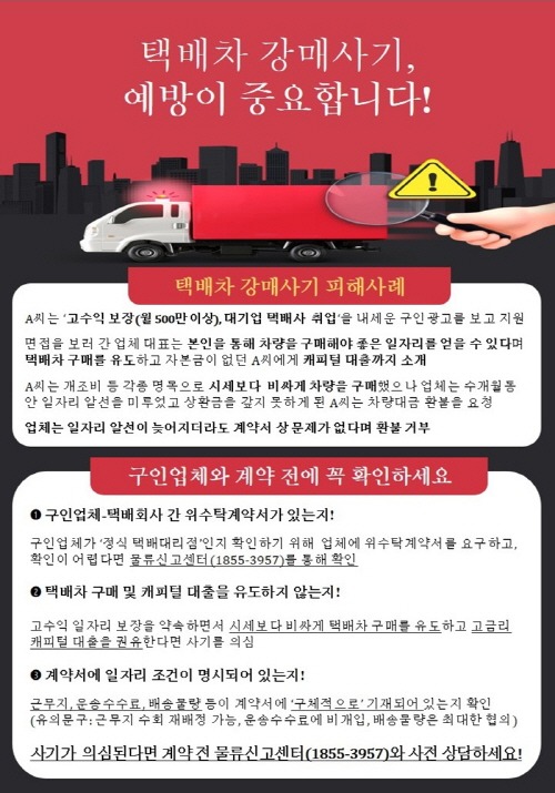 정부가 계약 전 필수 확인사항 안내, 구직자 교육 강화, 물류신고센터 사전 상담 등으로 ‘택배차 강매사기’ 예방에 나선다.