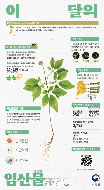 산림청은 6월 이달의 임산물로 자연 그대로의 건강함을 머금은 ‘산양삼’을 선정했다고 28일 밝혔다.