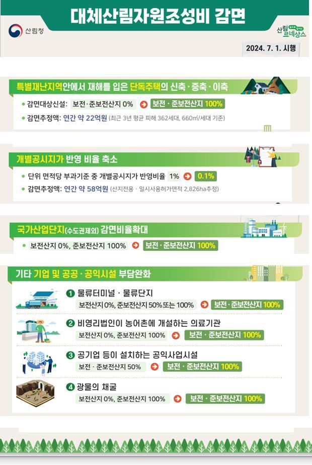 아울러 이번 산지관리법시행령 개정으로 수도권 외 지역의 국가산업단지, 농어촌에 개설하는 의료기관, 물류터미널·물류단지, 공기업 등이 시설하는 공익사업시설, 광물 채굴의 경우에도 대체산림자원조성비가 감면된다.