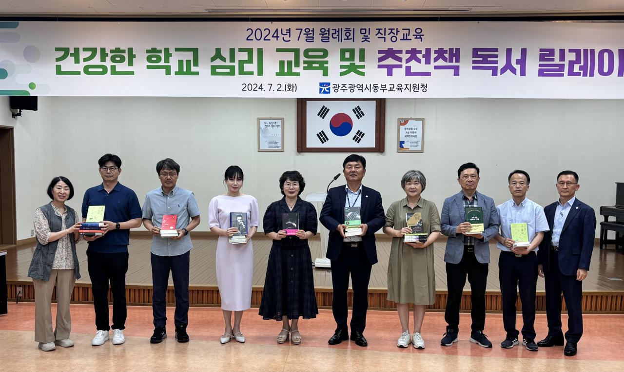 광주동부교육지원청이 2일 월례회에서 시교육청 역점사업인 ‘다시, 책으로’ 프로젝트의 실천을 위해 ‘추천책 독서 릴레이’를 실시했다.