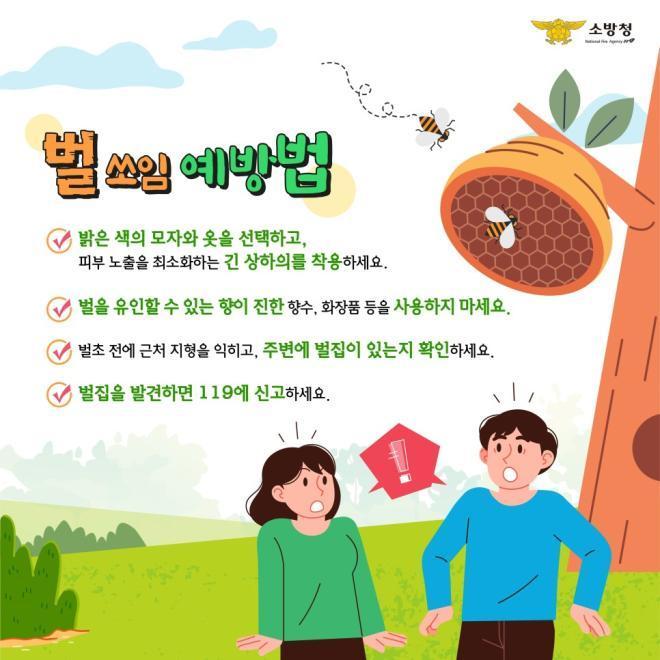 - 7월 ~ 9월 벌집 제거 출동 집중, 각별한 주의 필요! -- 야외활동 시 향수・화장품 사용자제, 어두운 계열의 옷 피해야 -