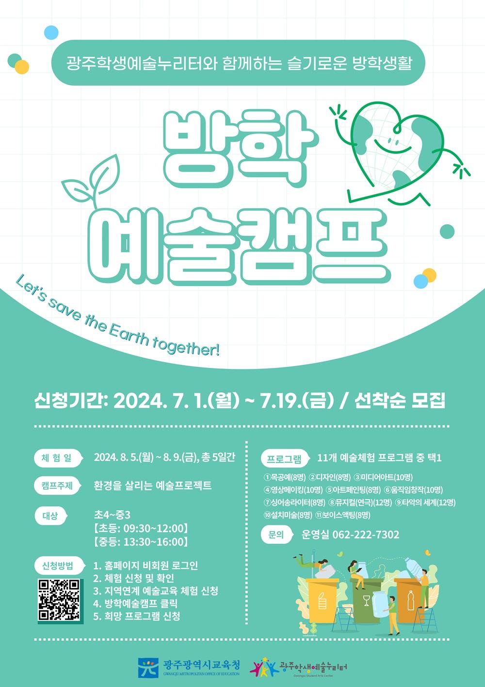 광주학생예술누리터가 지역연계 예술체험 프로그램 ‘방학예술캠프 Let’s save the Earth together’에 참여할 학생을 모집한다.