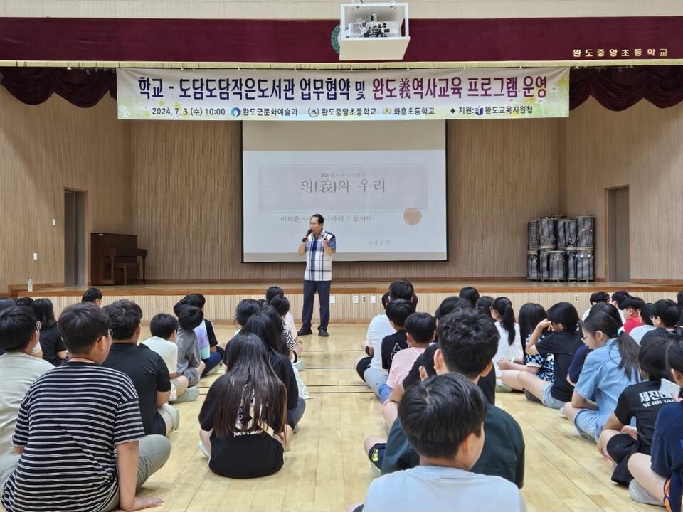 완도중앙초등학교는 7월 3일에 도담도담작은도서관에서 완도군 문화예술과, 완도군청 문화예술과 도서관팀, 완도교육지원청 관계자, 학부모가 참석한 가운데, ‘완도독서인문교육 활성화를 위한 완도중앙초-도담도담작은도서관 업무협약’을 체결했다.
